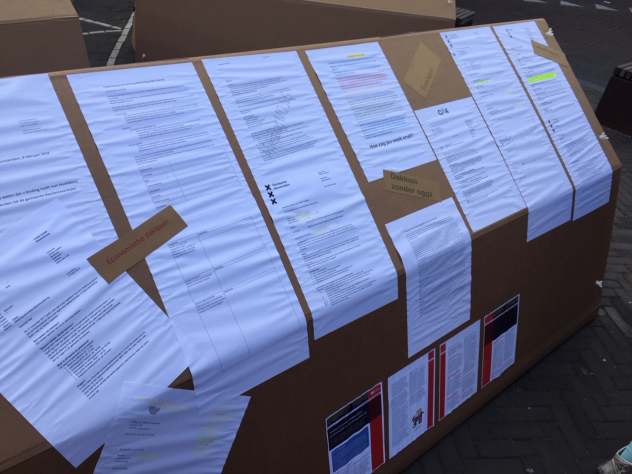 .Last week it was alreadyannounced: there is a manifestation coming! This morning, in front of the Claver House on the Elandsgracht, it will start at 07:00. Twenty-four cardboard tents will be set up. These are symbolic of the twenty-four economically homeless who are added to Amsterdam every week.