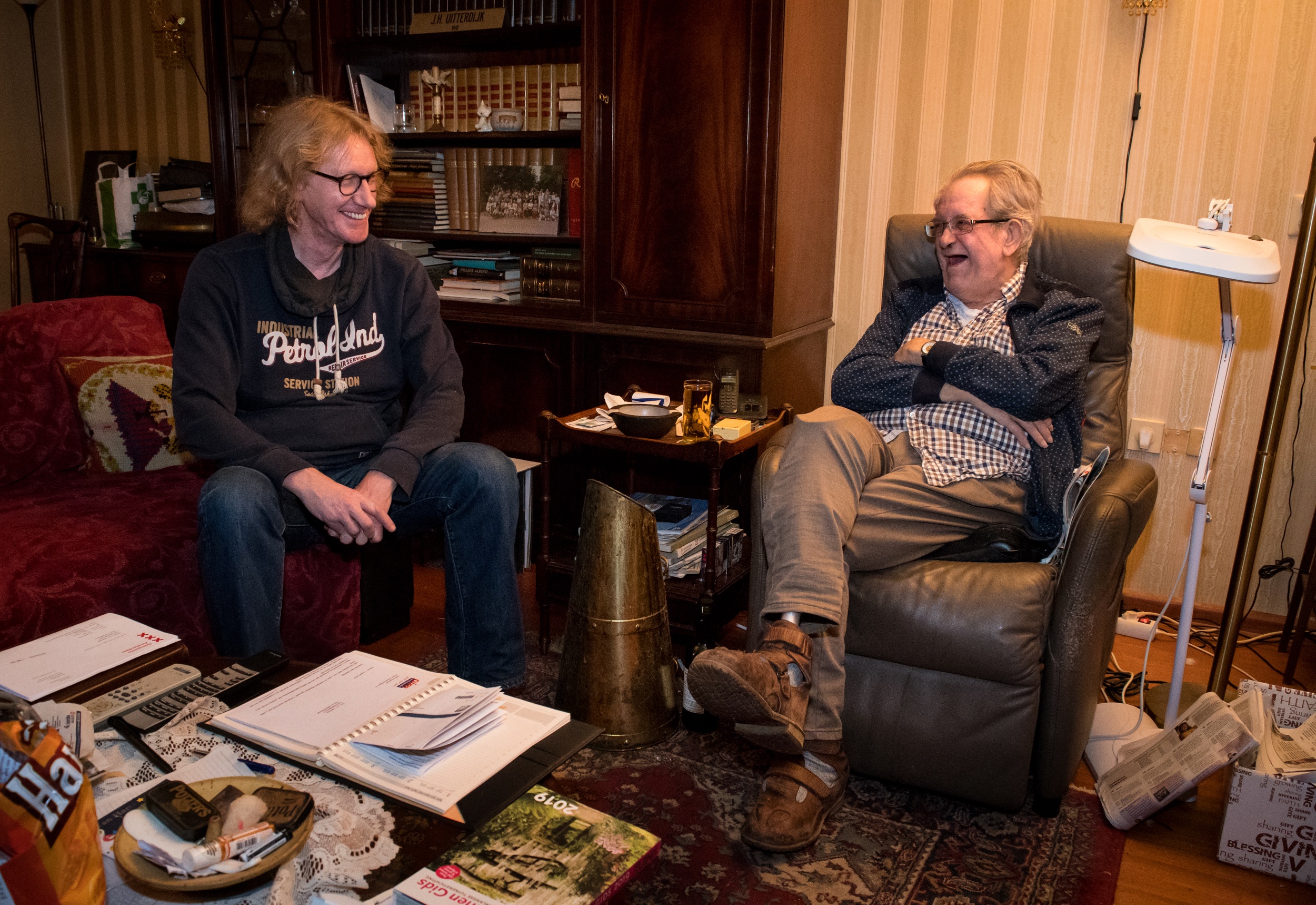 “Ik heb hier heel wat dagen gezeten”, zegt Aart. De boomlange buddy moet gewoon wennen dat hij vandaag geen aantekeningen hoeft te maken. “Altijd als ik hier was, zat ik op de bank met mijn laptop op schoot en liet ik Jaap vertellen. Daarna ben ik twee weken in een huisje gaan zitten bij de Vinkeveense plassen en heb ik van al die aantekeningen dit boek gemaakt. Wat me het meest fascineert aan Jaap zijn de vele levens die hij heeft gehad. Van boekhouder in Andijk tot VVD-raadslid in Amsterdzam Oud-West. En alles daar tussenin. Nu zien we elkaar niet meer voor het boek, maar we blijven vrienden, zoals ik met al mijn oude buddy’s vrienden ben gebleven. We moeten snel weer eens een broodje gaan eten, vind je ook niet Jaap?”