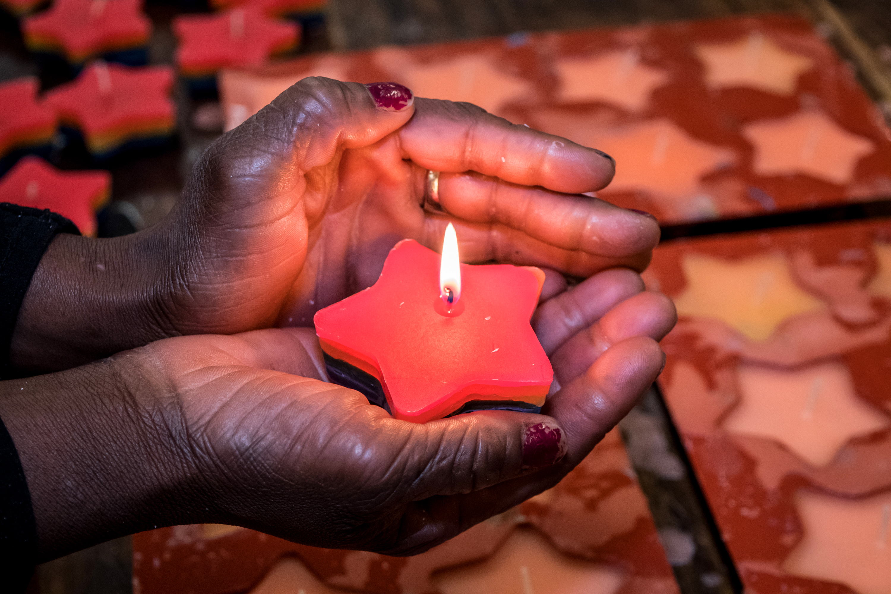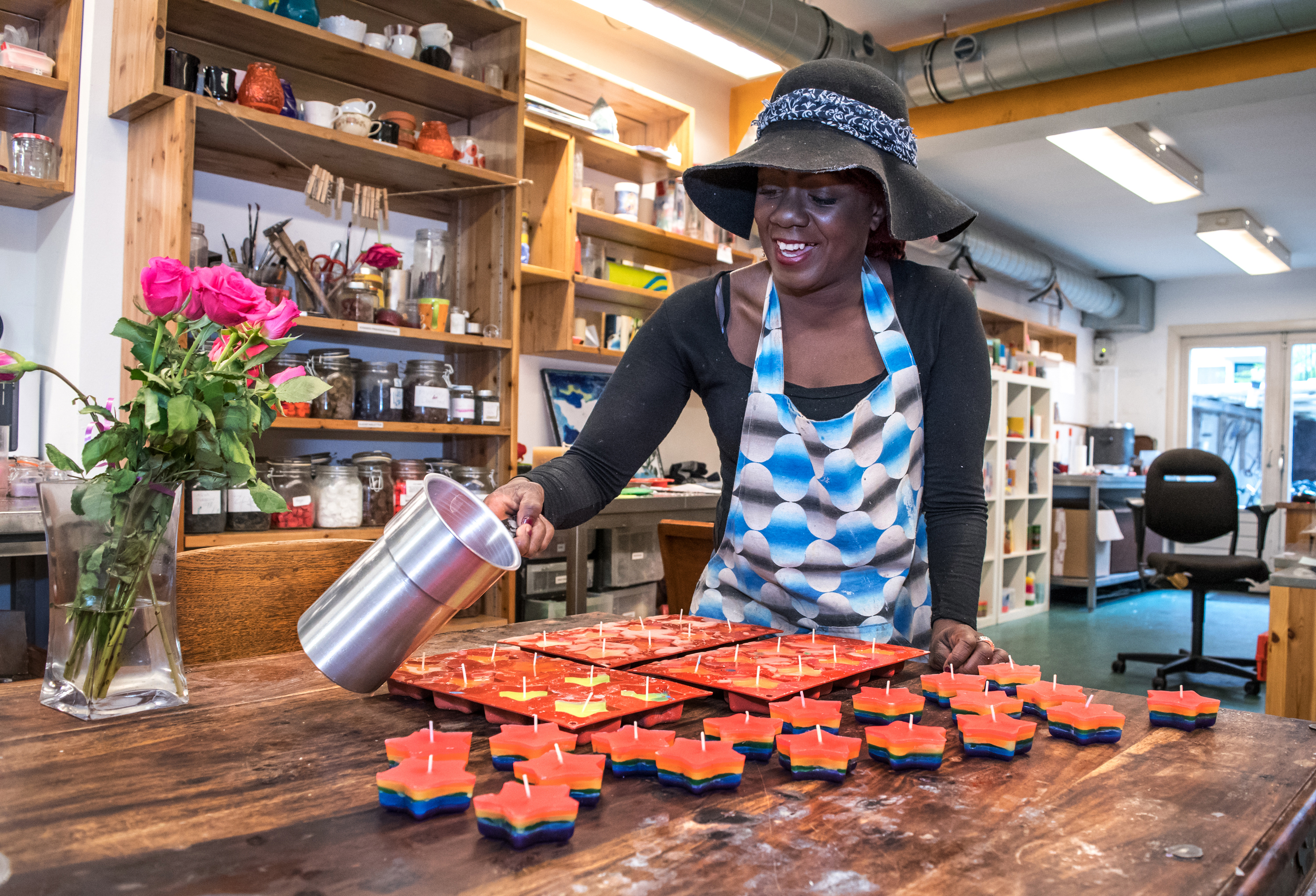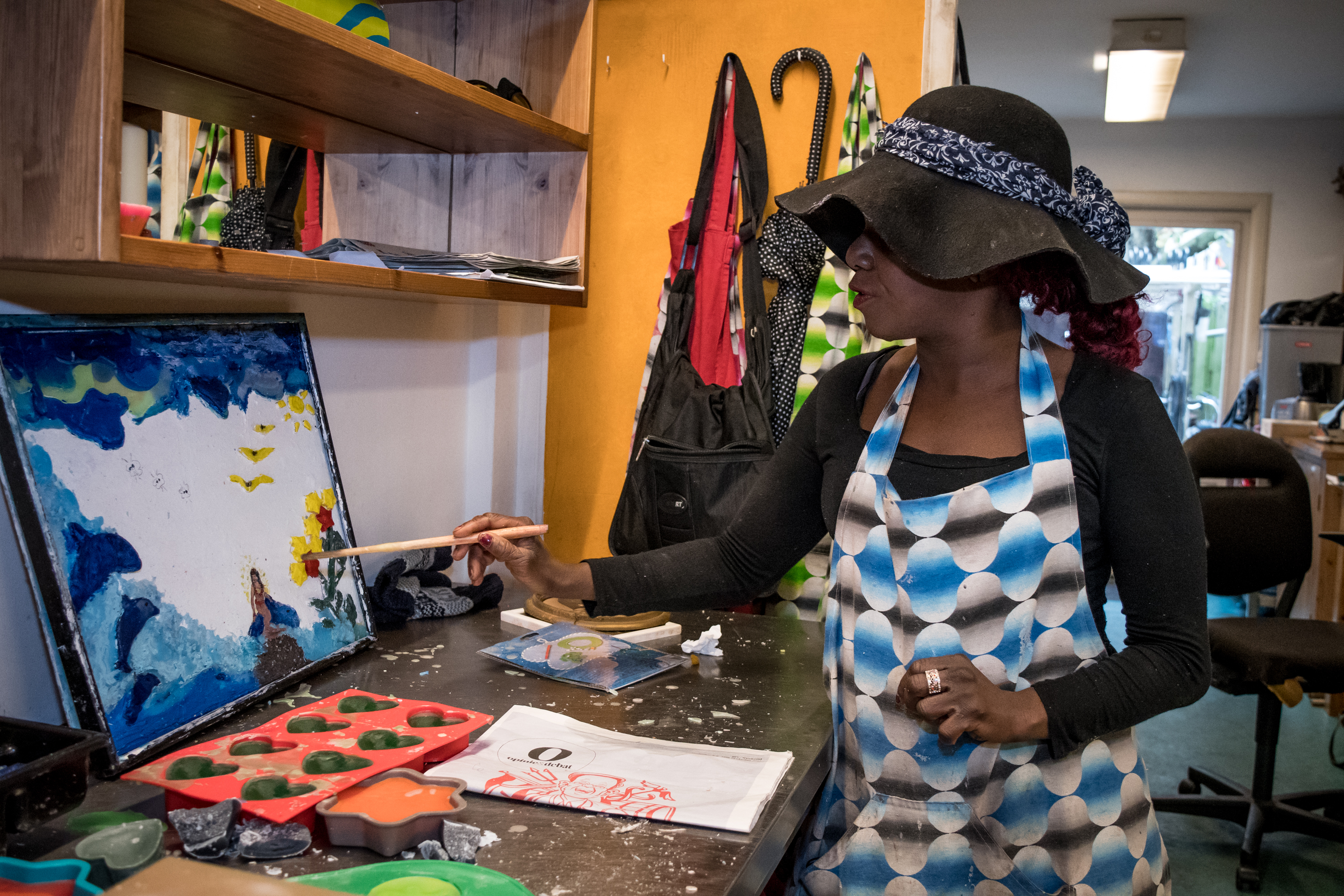 We staan in de kaarsenmakerij Colors naast inloophuis Oud-West op de Bilderdijkstraat. Colors is een project van De Regenboog Groep waar mensen met een grote afstand tot de arbeidsmarkt een zinvolle dagbesteding vinden. Bianca werkt er drie dagen per week. Het is zeker niet haar eerste dagbestedingsproject. “Ik heb zo’n beetje aan alle dagbestedingen meegedaan die de gemeente me aanbod. Ik heb bij boer Piet gewerkt, bij boer André, bij boer Martijn. Echt boerinnenwerk in al die kleine dorpies om Amsterdam heen, Broek en Waterland en zo. Maar eigenlijk ben ik kunstenares. Ik maak allemaal souvenirs van Fimo klei voor toeristen, daar ben ik heel goed in. Breien doe ik ook. Ik brei een sjaal in zes uurtjes. En ik maak schilderijen van paraffine, waar je ook kaarsen van maakt.