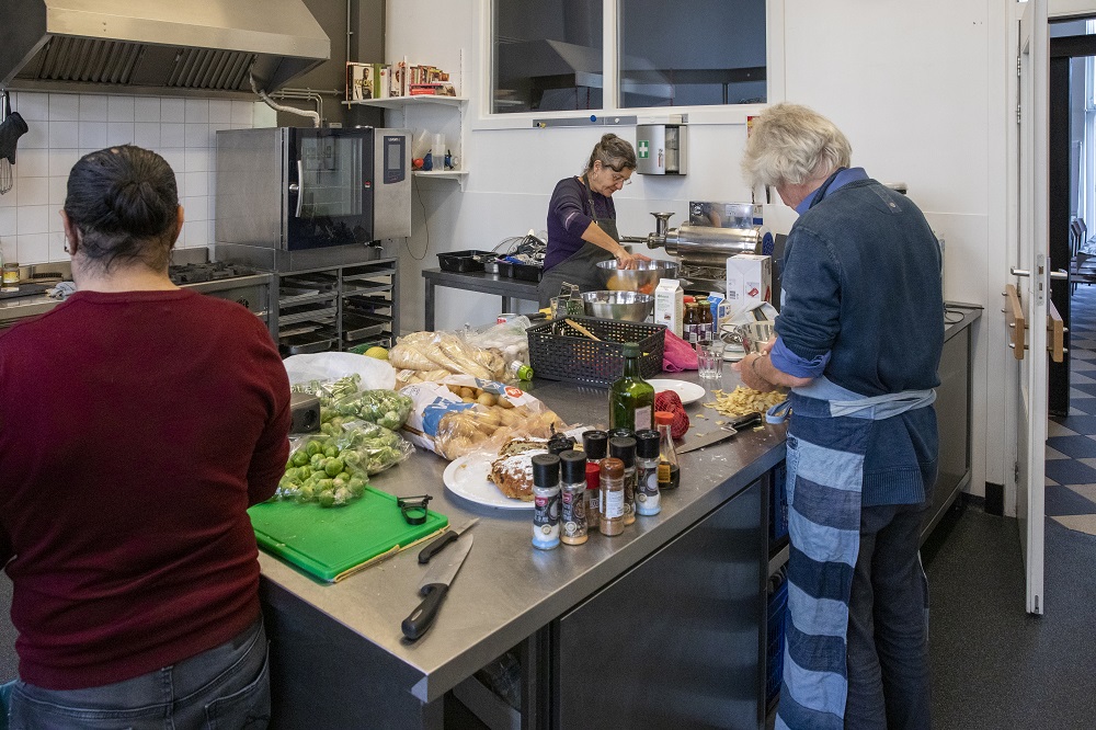 Katerina werkte als professioneel kok in een restaurant, tot ze artrose kreeg. “Dag in, dag uit in het hectische horecaproces meedraaien lukte niet meer. Door De Regenboog Groep kan ik mijn passie voor mijn vak toch nog een beetje in de praktijk brengen. Het is heerlijk om mijn eigen menu’s te bedenken. Om maaltijden te bereiden die lekker, gezond en een beetje origineel zijn. Dat doe ik met heel veel genoegen, bijgestaan door twee of drie hulpkoks. Ik doe de boodschappen vooraf, ik sta op donderdag aan het fornuis en heb de regie, de vrijwilligers doen het voorbereidende keukenwerk, zoals het wassen en snijden van de ingrediënten. Voordat de gasten komen, dekken ze de tafel. Later serveren ze de maaltijd, ruimen ze de tafels af en helpen ze met de afwas. Het zijn mensen die nuttig willen bezig zijn. De meesten van hen nemen niet deel aan het gangbare arbeidsproces. Andere vrijwilligers hebben wel een vaste baan. Ze proberen de maatschappij een stukje mooier te maken en beleven daar veel plezier aan. Ook voor mij geldt dat.”